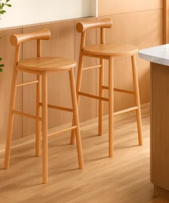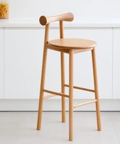 Crafted with a modern aesthetic, this wooden bar stool features a sleek round seat and a gently curved backrest for added comfort and style. Its simple form fits naturally into a variety of interior settings. The stool is supported by sturdy legs with integrated footrests, providing balance and ease while seated. Its natural wood tones bring warmth and character to the design, making it suitable for both casual and contemporary spaces.