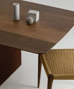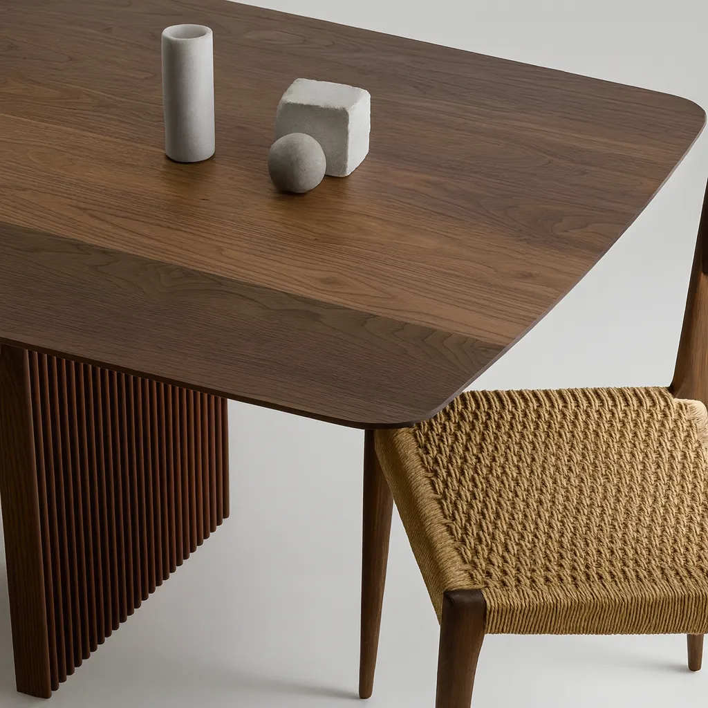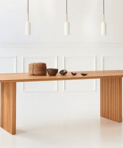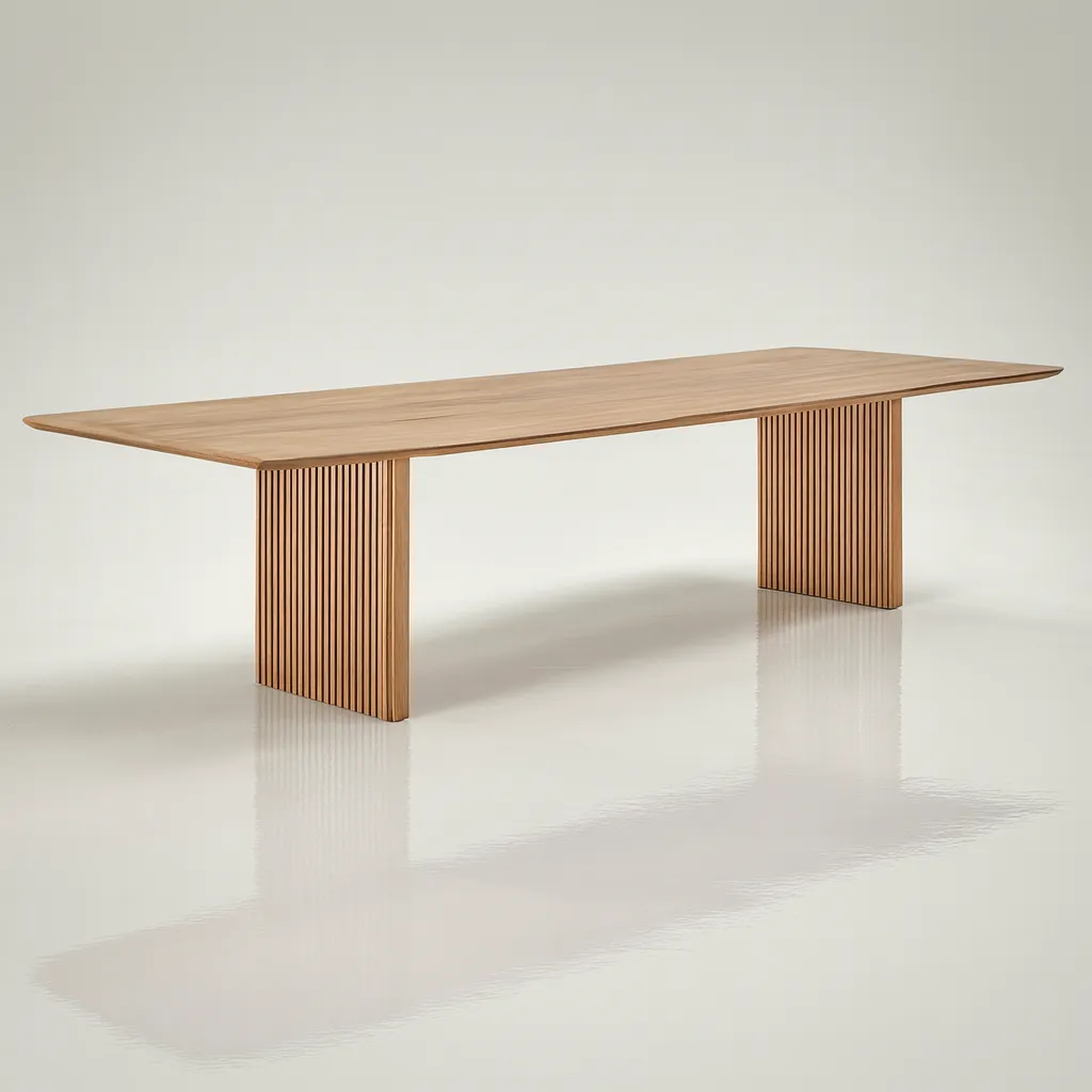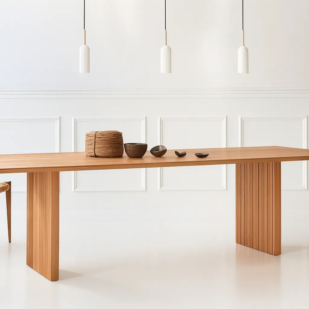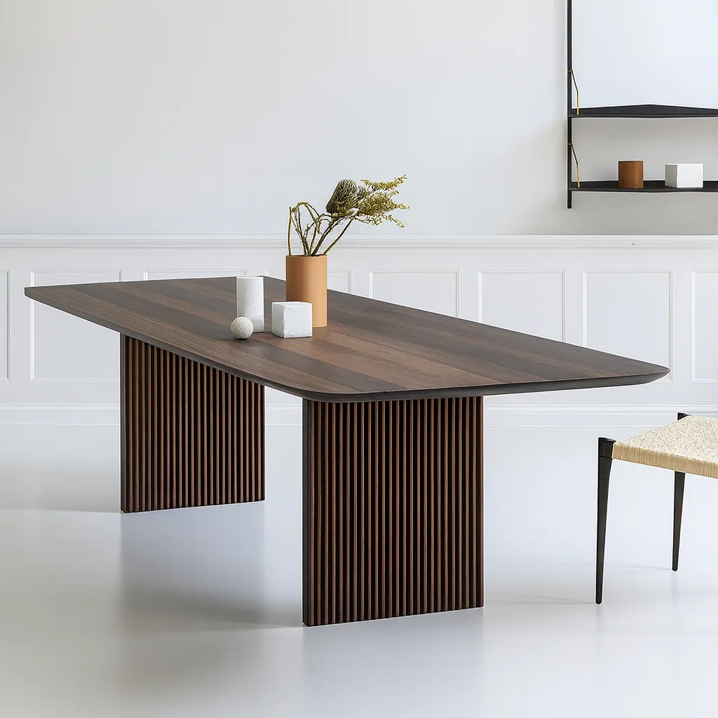This contemporary wooden dining table combines a spacious rectangular top with sculpted pedestal legs, bringing elegance and function to dining spaces.
