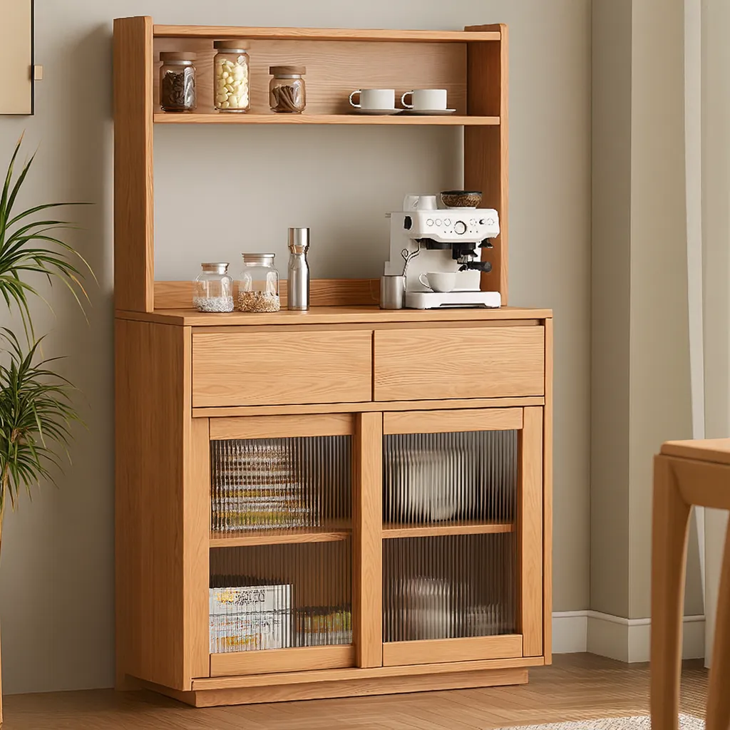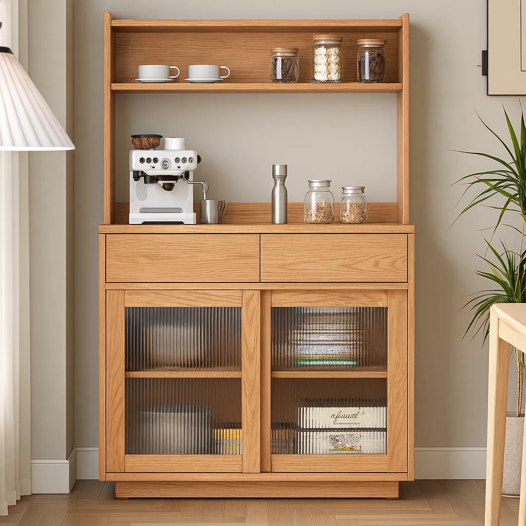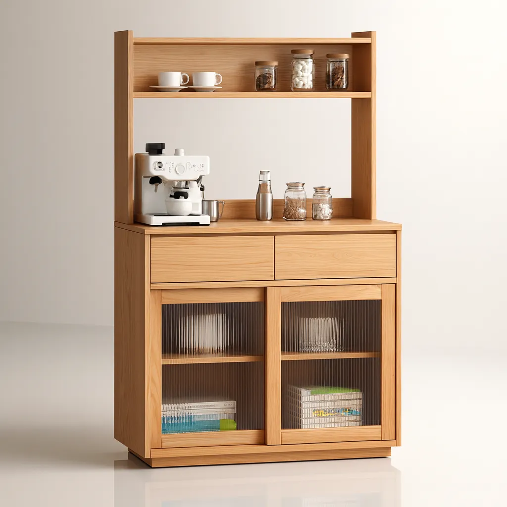 This modern kitchen storage cabinet features open shelves, drawers, and sliding doors, offering a practical solution for organizing kitchen essentials.