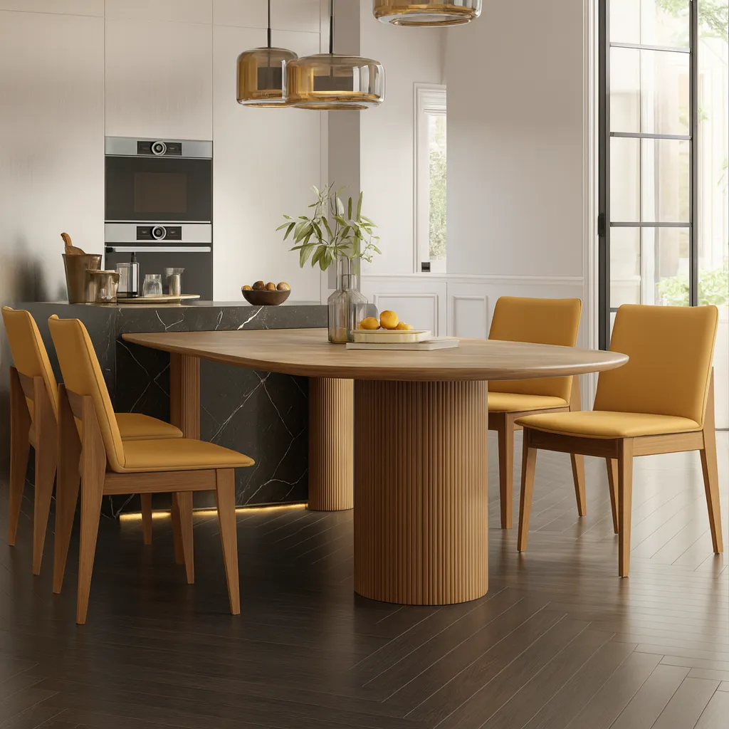With its refined oval design, this dining table brings both style and practicality to everyday meals. The smooth surface provides ample space for family dining, while the rounded edges create a softer look that blends seamlessly with contemporary interiors. The table is supported by a cylindrical pedestal base, which ensures stability and adds a bold design element. Its well-balanced proportions make it suitable for both small and large kitchens, enhancing the overall dining experience.