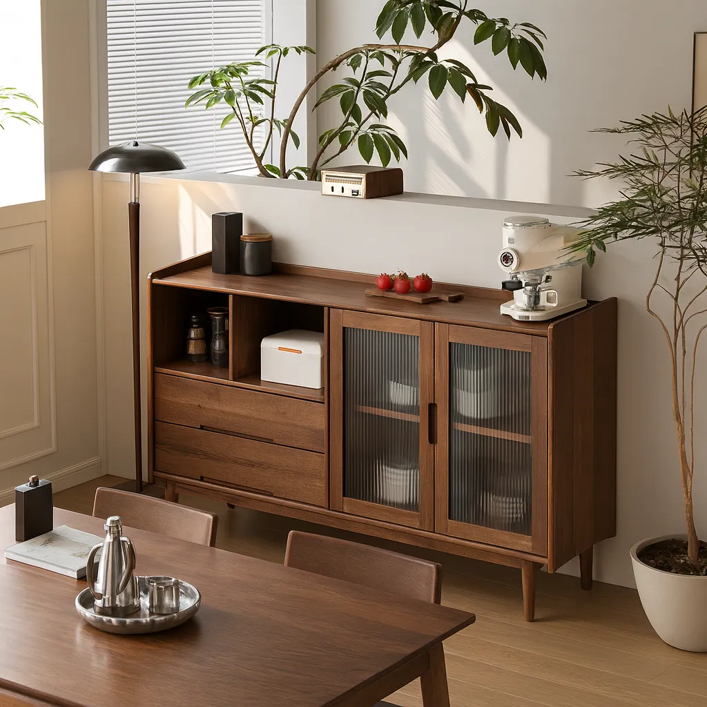 This modern sideboard cabinet features drawers, open shelves, and sliding doors, offering versatile storage for kitchen organization.