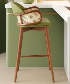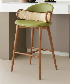 Blending modern design with natural elements, this bar stool pairs a smooth cushioned seat with a woven cane backrest. The curved armrests add both support and visual appeal, while the solid wooden legs create a sturdy foundation.The stool includes a built-in footrest for added comfort, making it suitable for extended seating. Its combination of soft upholstery, cane accents, and warm wood tones creates a balanced design that works well in contemporary and transitional interiors.