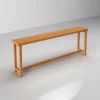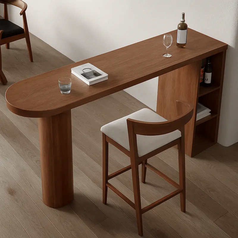 This modern wooden bar table combines a rounded-edge design with a dual base, featuring built-in shelves for convenient storage.