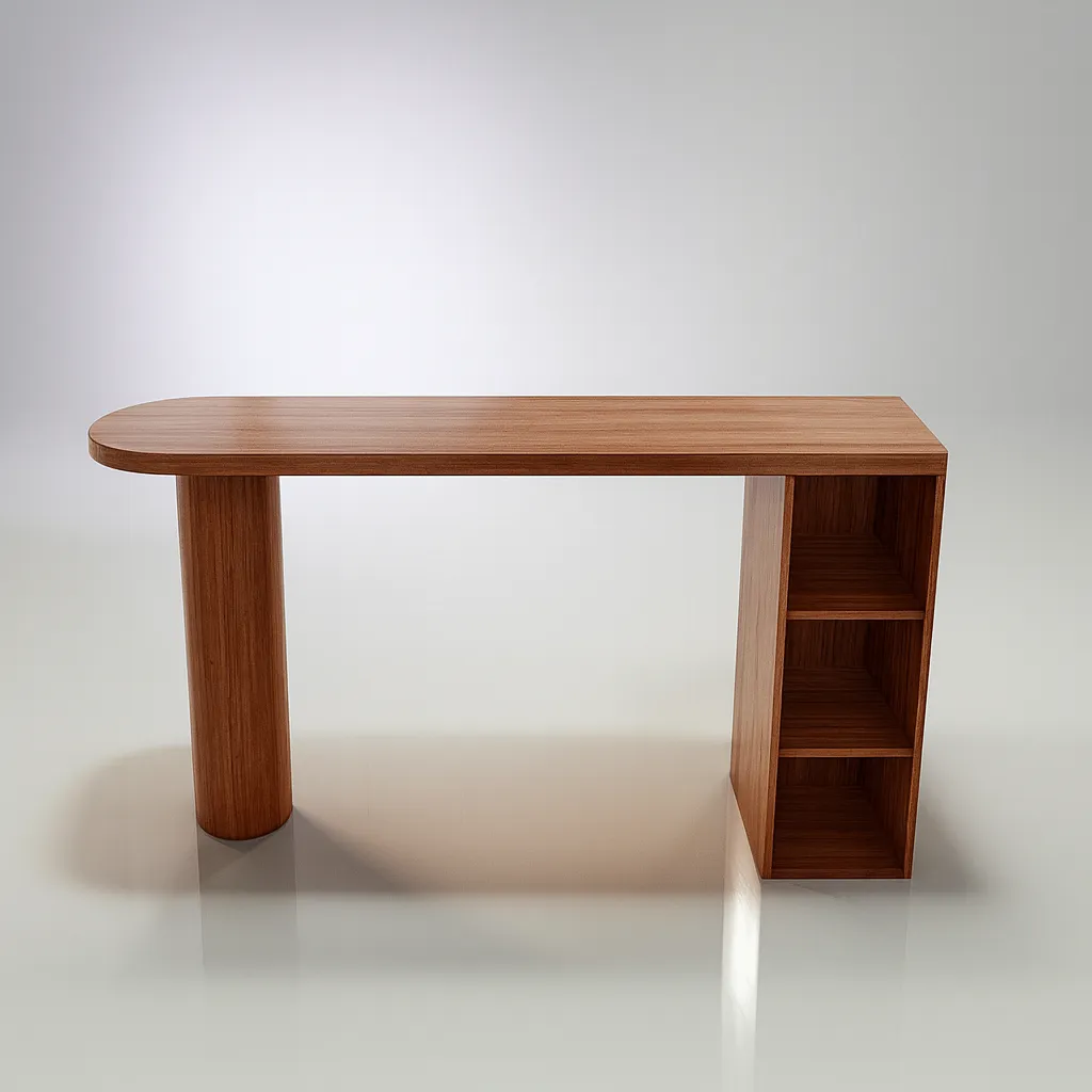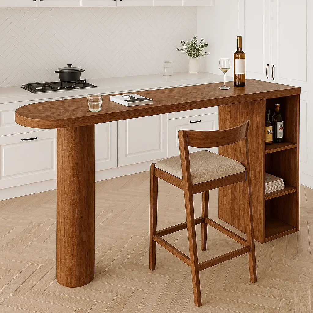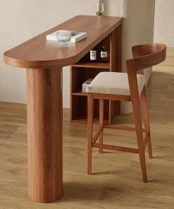 Crafted with a modern touch, this wooden bar table stands out with its clean lines and versatile structure. The tabletop features a unique mix of straight and rounded edges, bringing a balanced look to contemporary interiors. The dual base design includes a cylindrical leg on one side and an integrated shelving unit on the other, offering both stability and practical storage. The open shelves provide space for keeping bottles, glassware, or essentials close at hand, making it as functional as it is stylish.