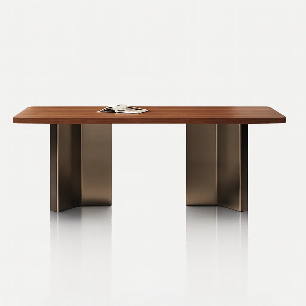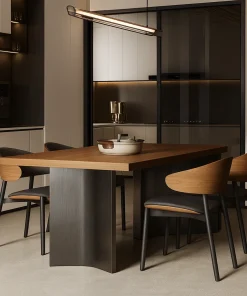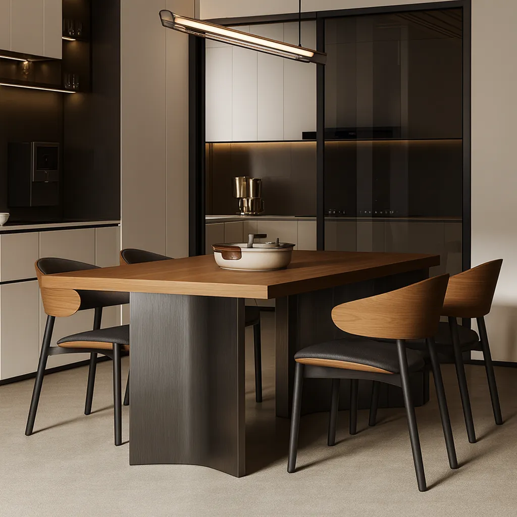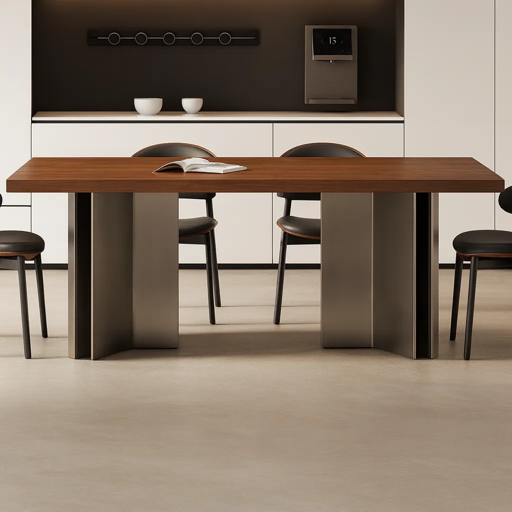 This modern wooden rectangular dining table features a wood top and sculpted metal base, offering both durability and a refined contemporary look.