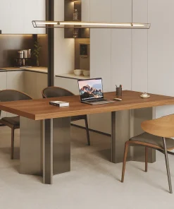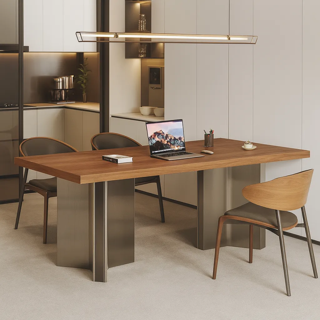 Designed with a modern aesthetic, this rectangular wooden dining table blends natural warmth with industrial strength. The broad tabletop provides ample space for family dining, entertaining, or working from home, making it a versatile addition to everyday living. Its sturdy metal base not only ensures stability but also introduces a sleek contrast that enhances the overall design. The combination of wood and metal creates a balanced look that complements both modern and transitional interiors.
