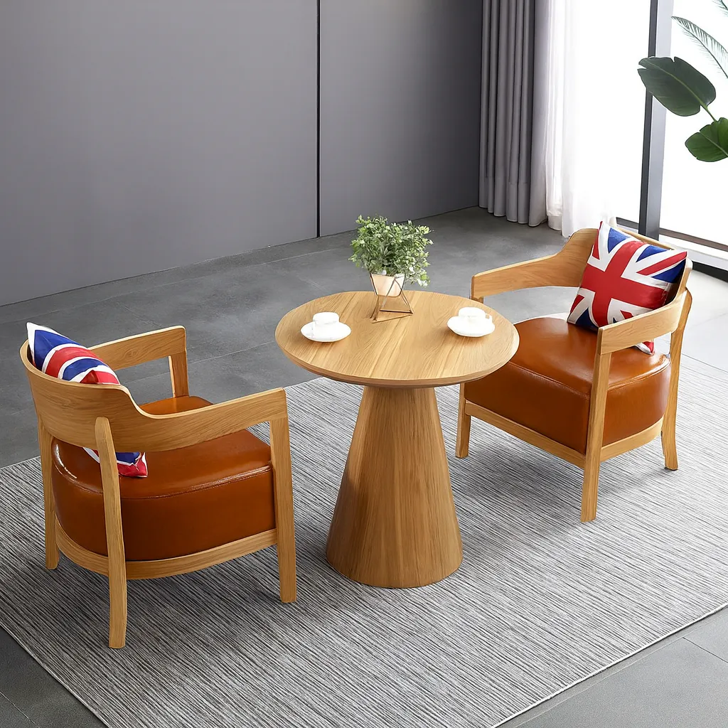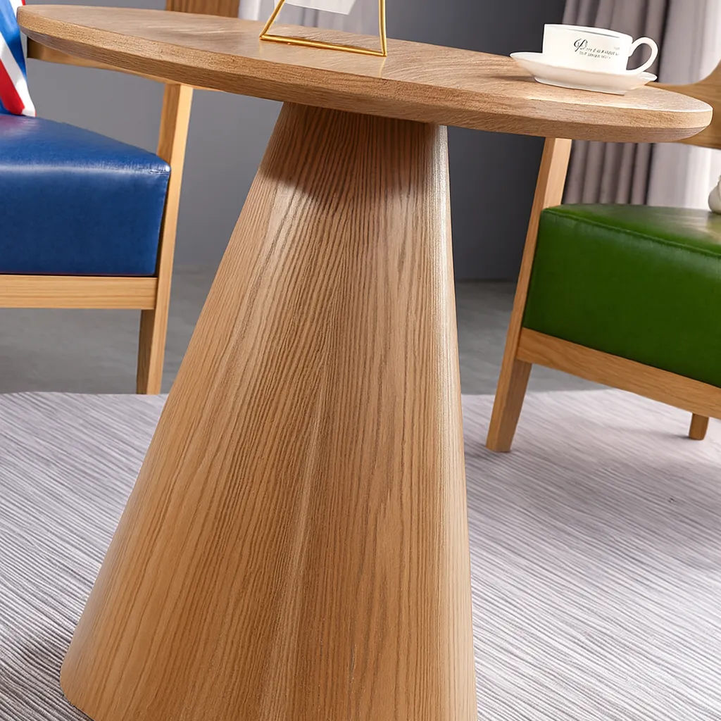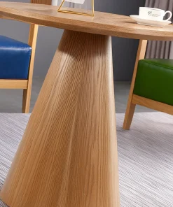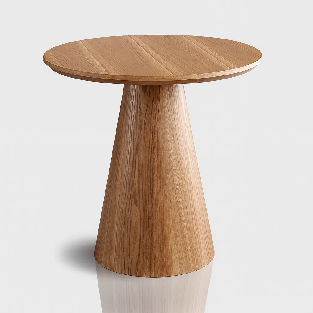 This modern wooden round dining table features a smooth circular top and a cone-shaped pedestal base, creating a stylish focal point for dining spaces.