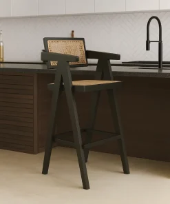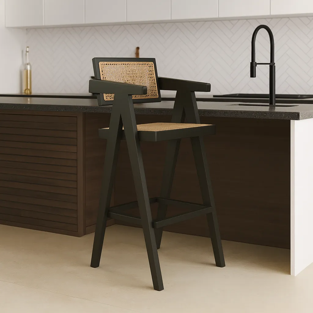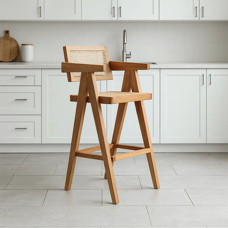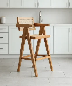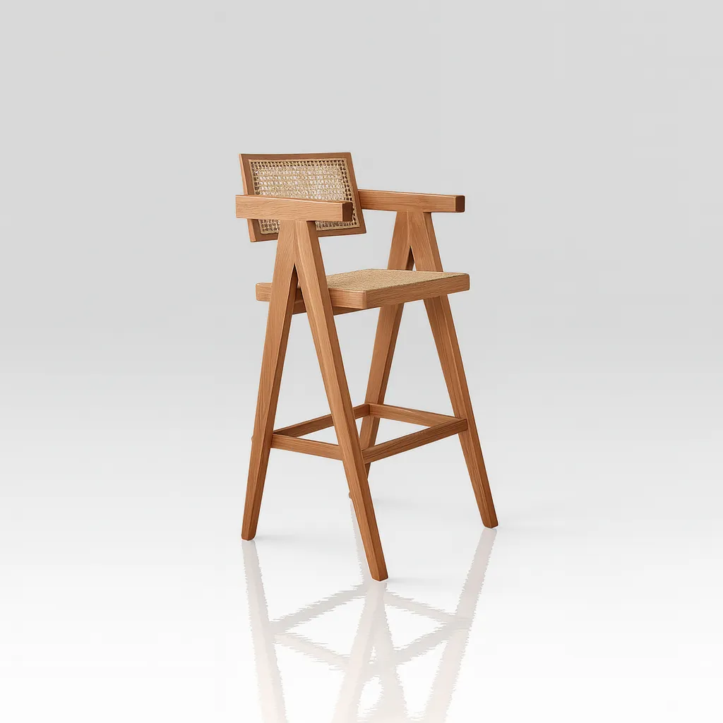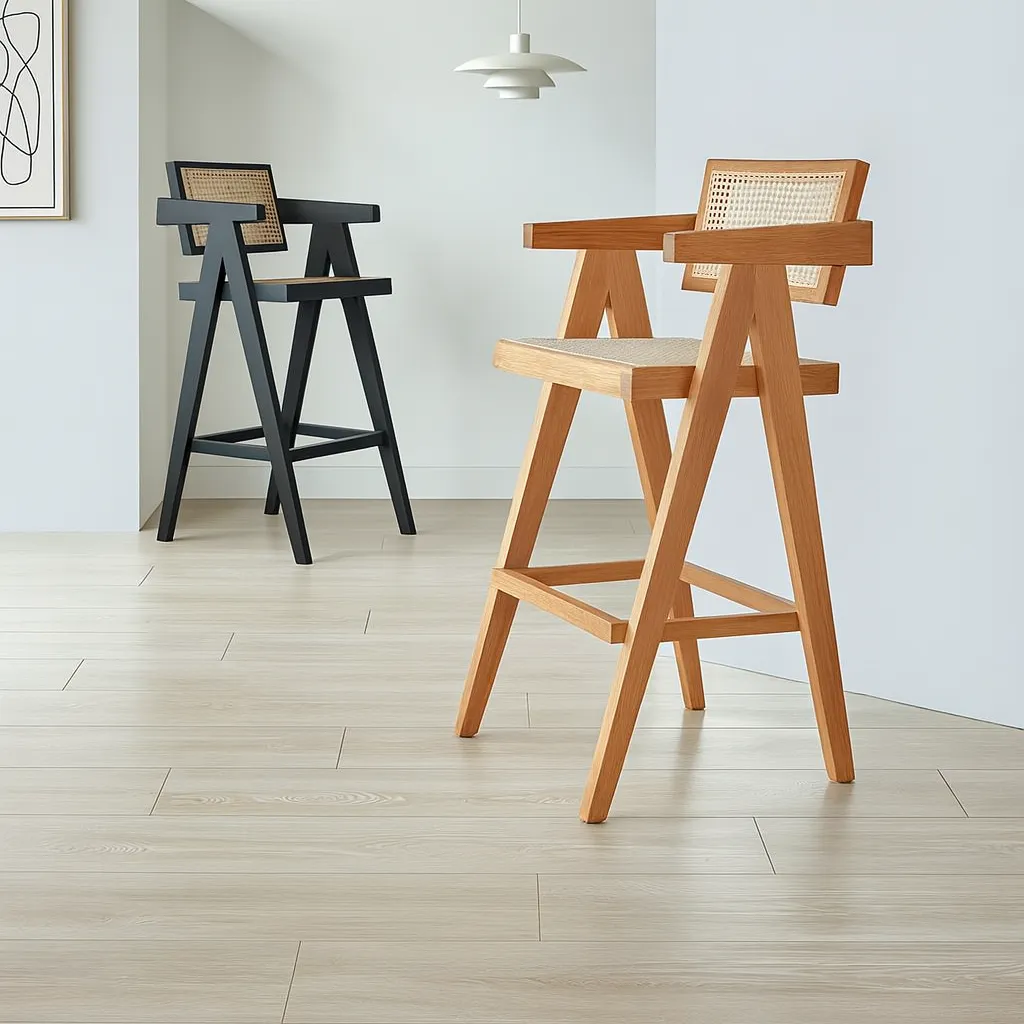 Designed with Scandinavian inspiration, this wooden bar stool balances modern form with natural details. Its open backrest with woven rattan adds a touch of texture, while the angled frame creates a distinctive silhouette. The stool includes armrests and a footrest for added support, making it practical for long seating. The sturdy wooden structure ensures durability while maintaining a clean and light appearance.